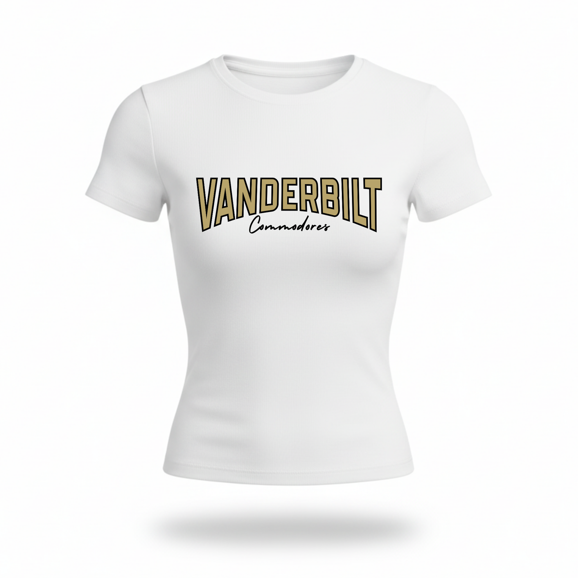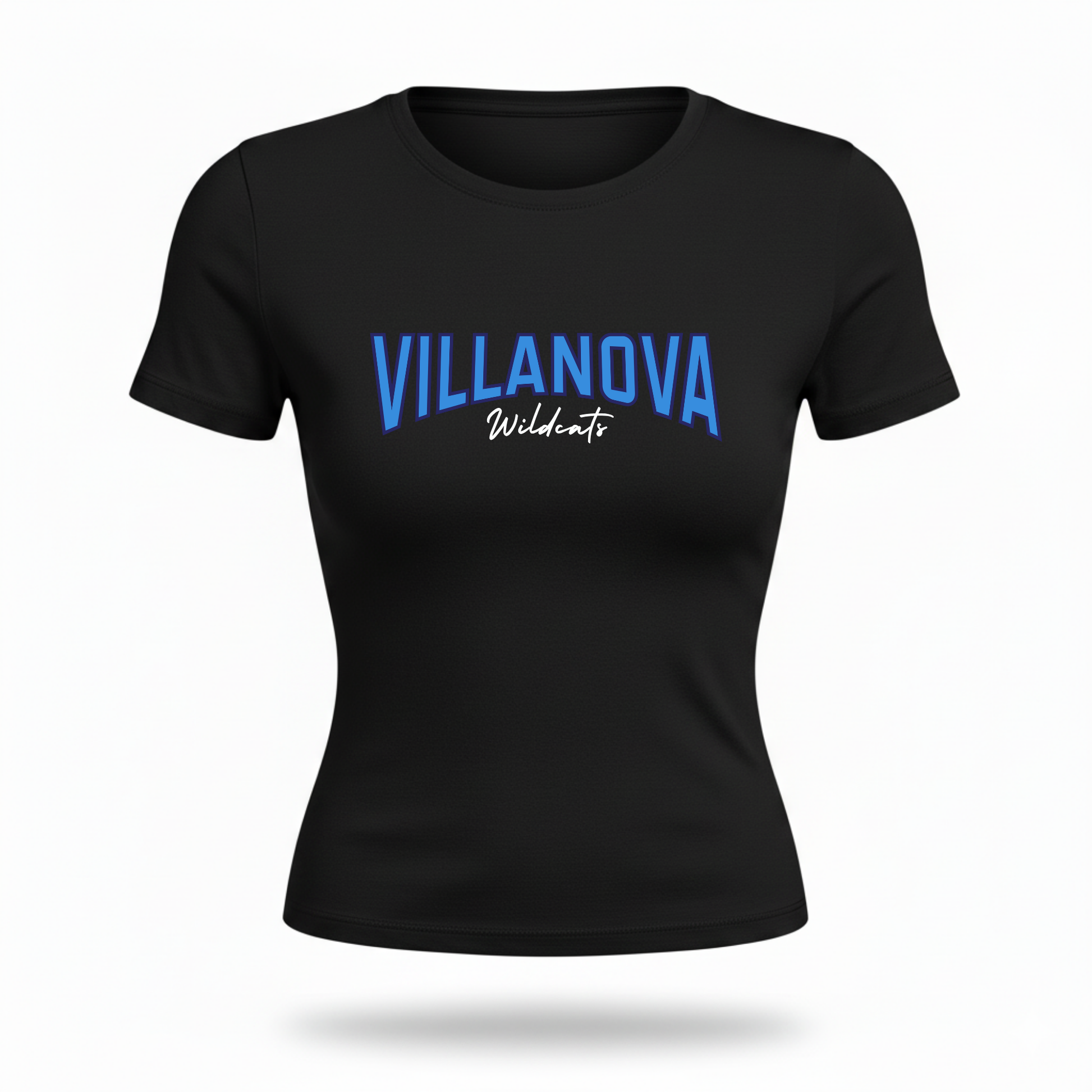 Fitted tee with bold duo color text along with scripted mascot underneath.