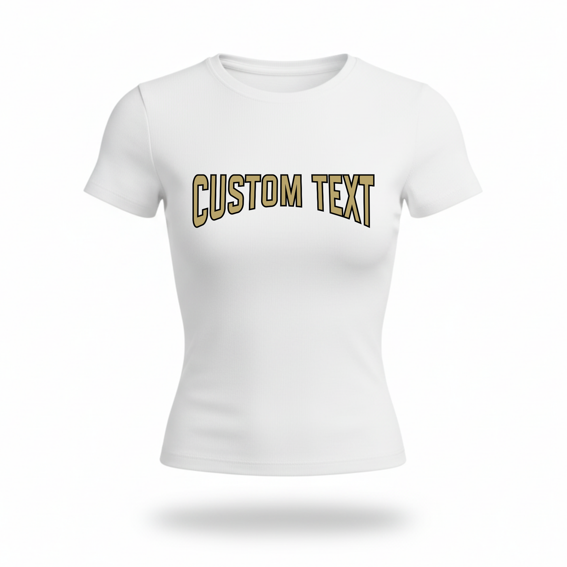 Fitted tee with bold duo color text half curved text.
