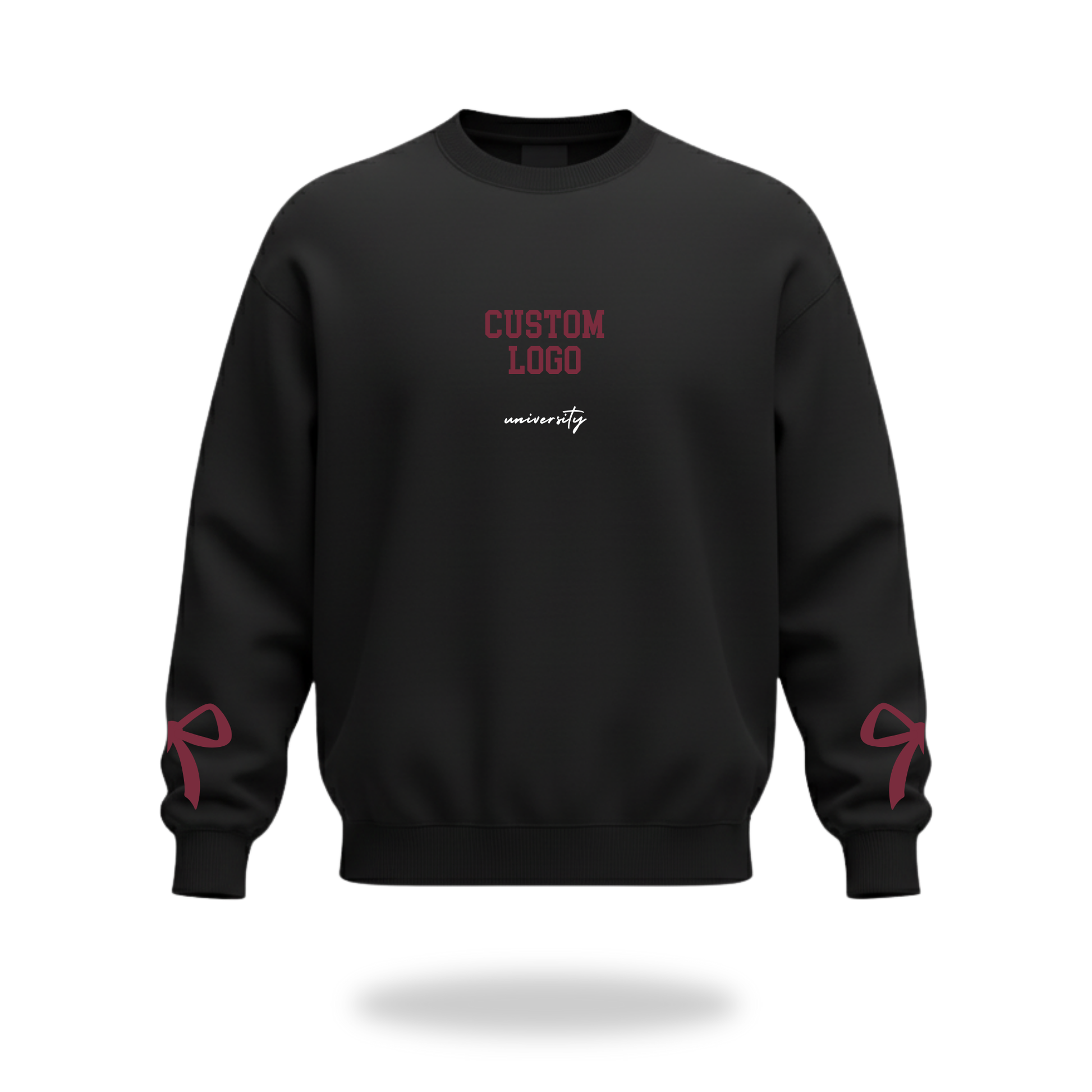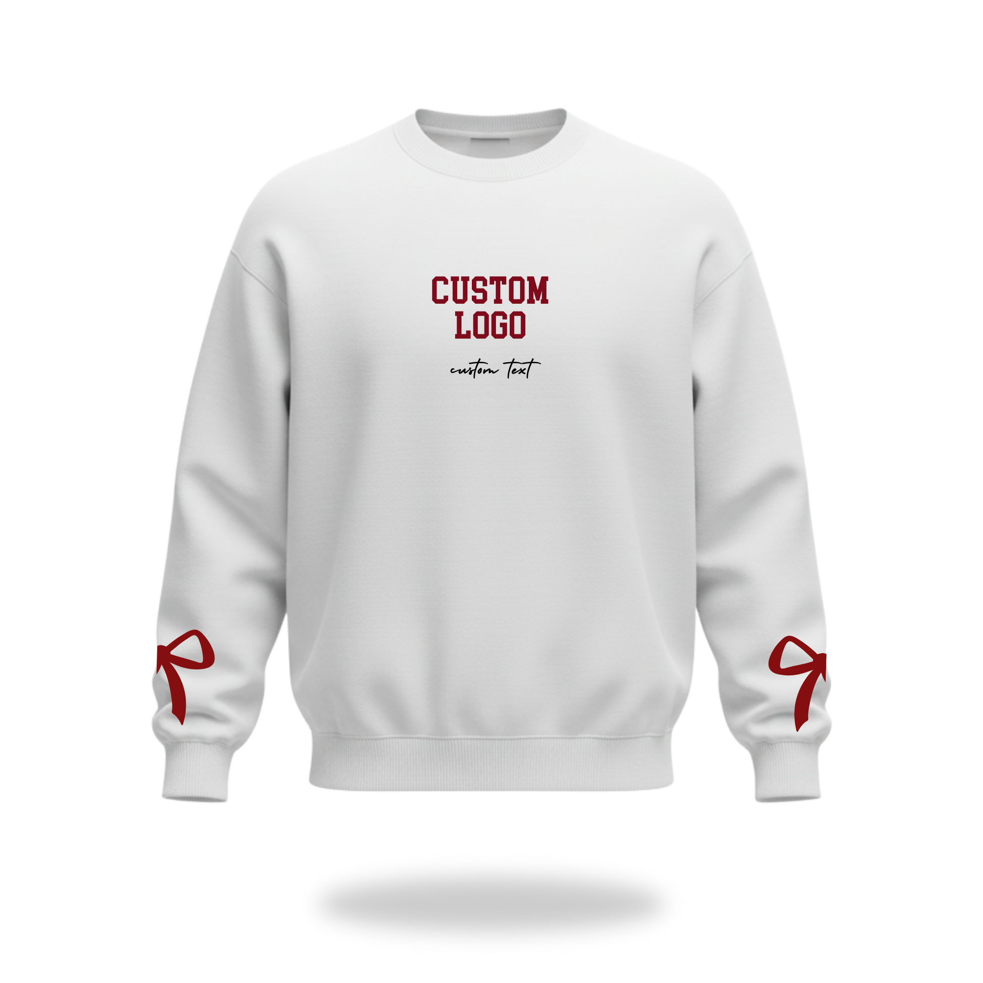 Crewneck with scripted text below custom logo/design along with a matching bow at the bottom of both sleeves.
