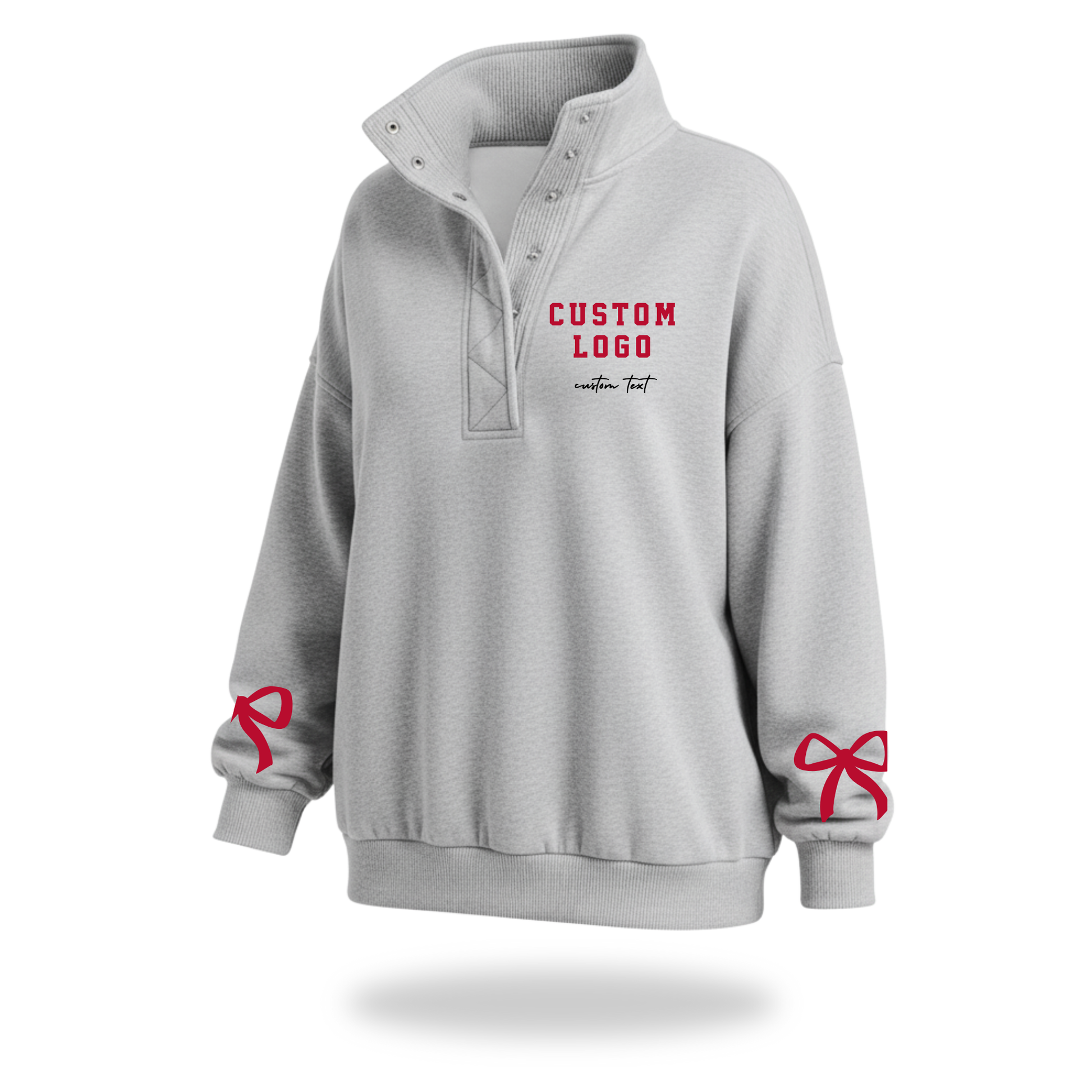 Gray henley pullover sweatshirt with scripted text below custom logo/design on the side chest along with a matching bow at the bottom of both sleeves.