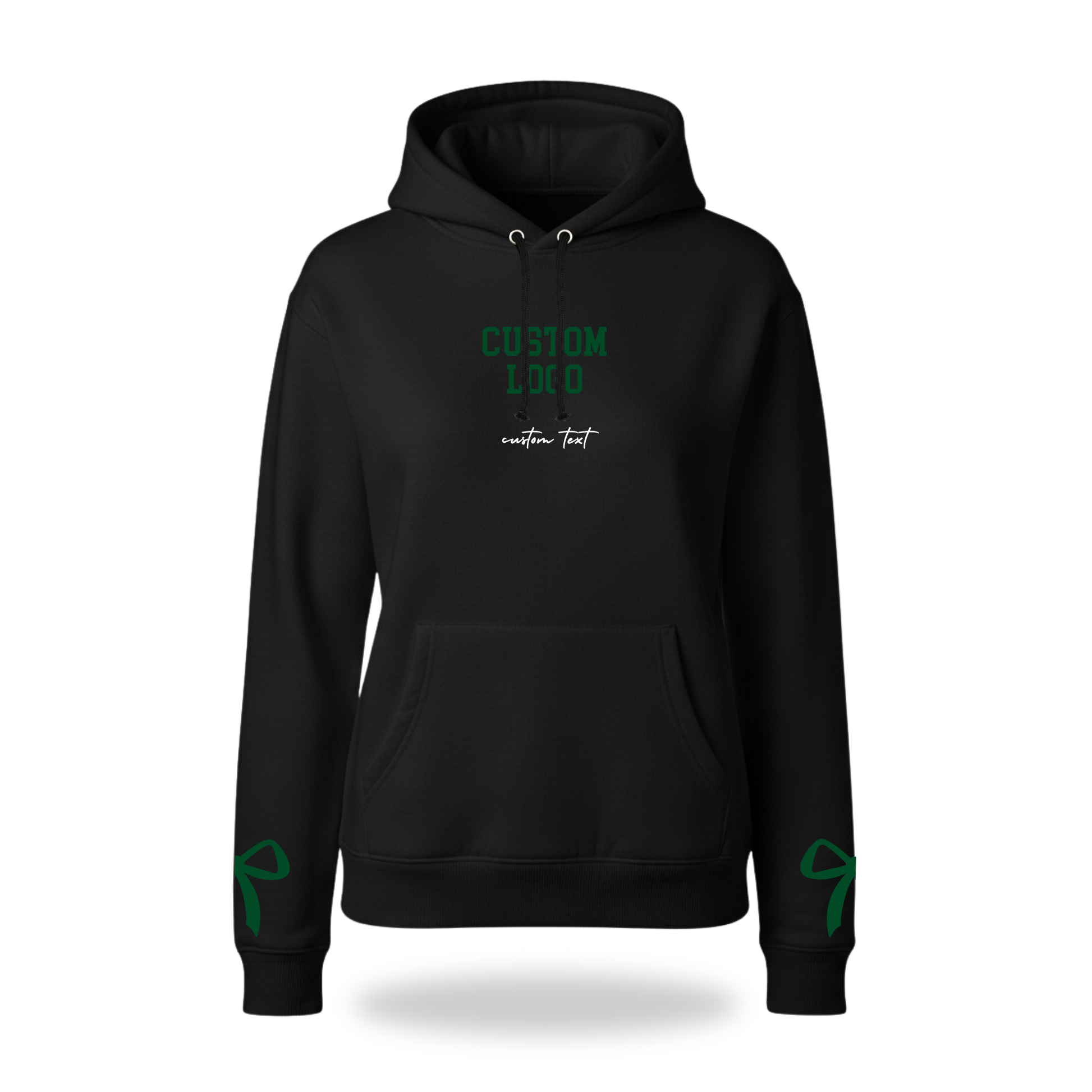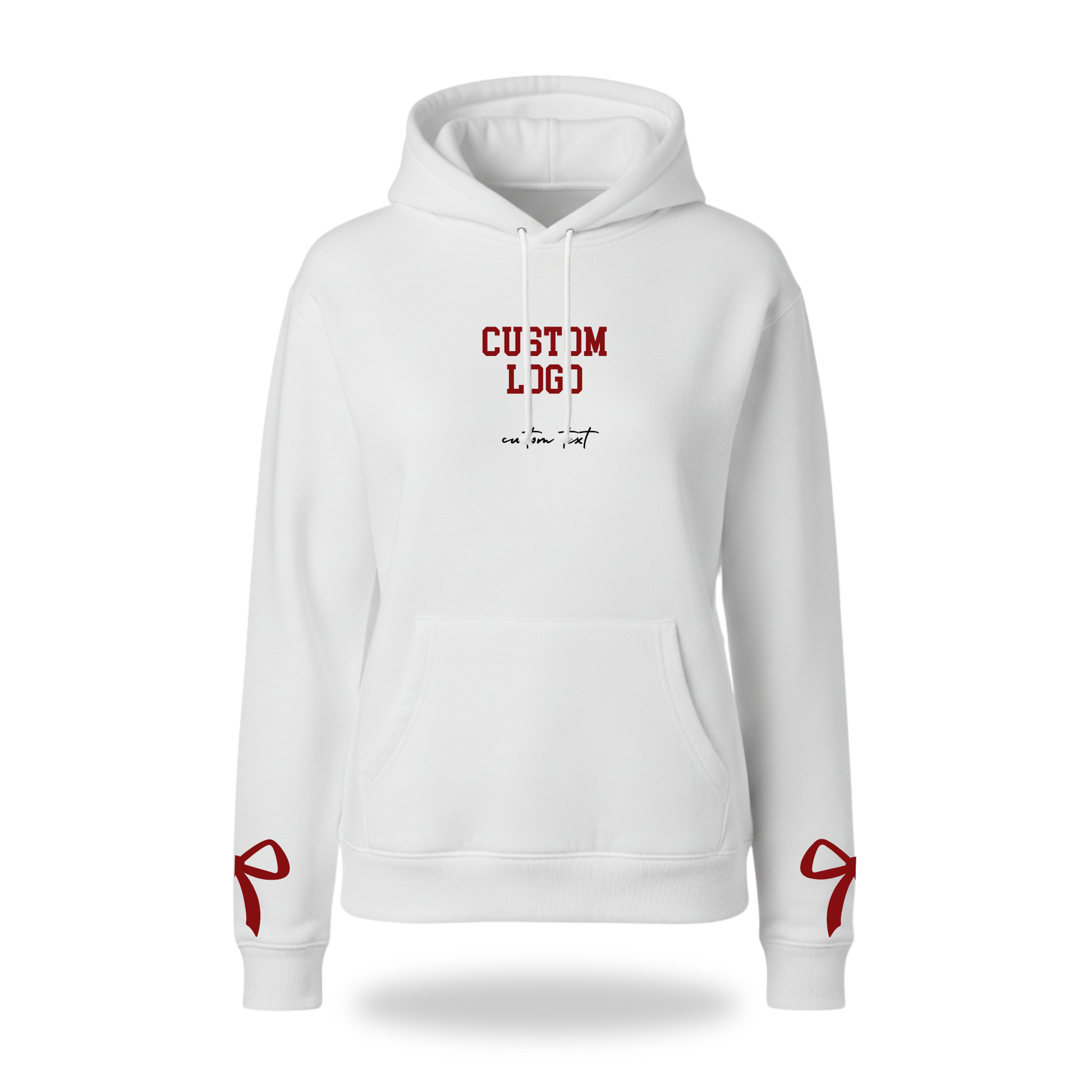 Hoodie with scripted text below custom logo/design along with a matching bow at the bottom of both sleeves.