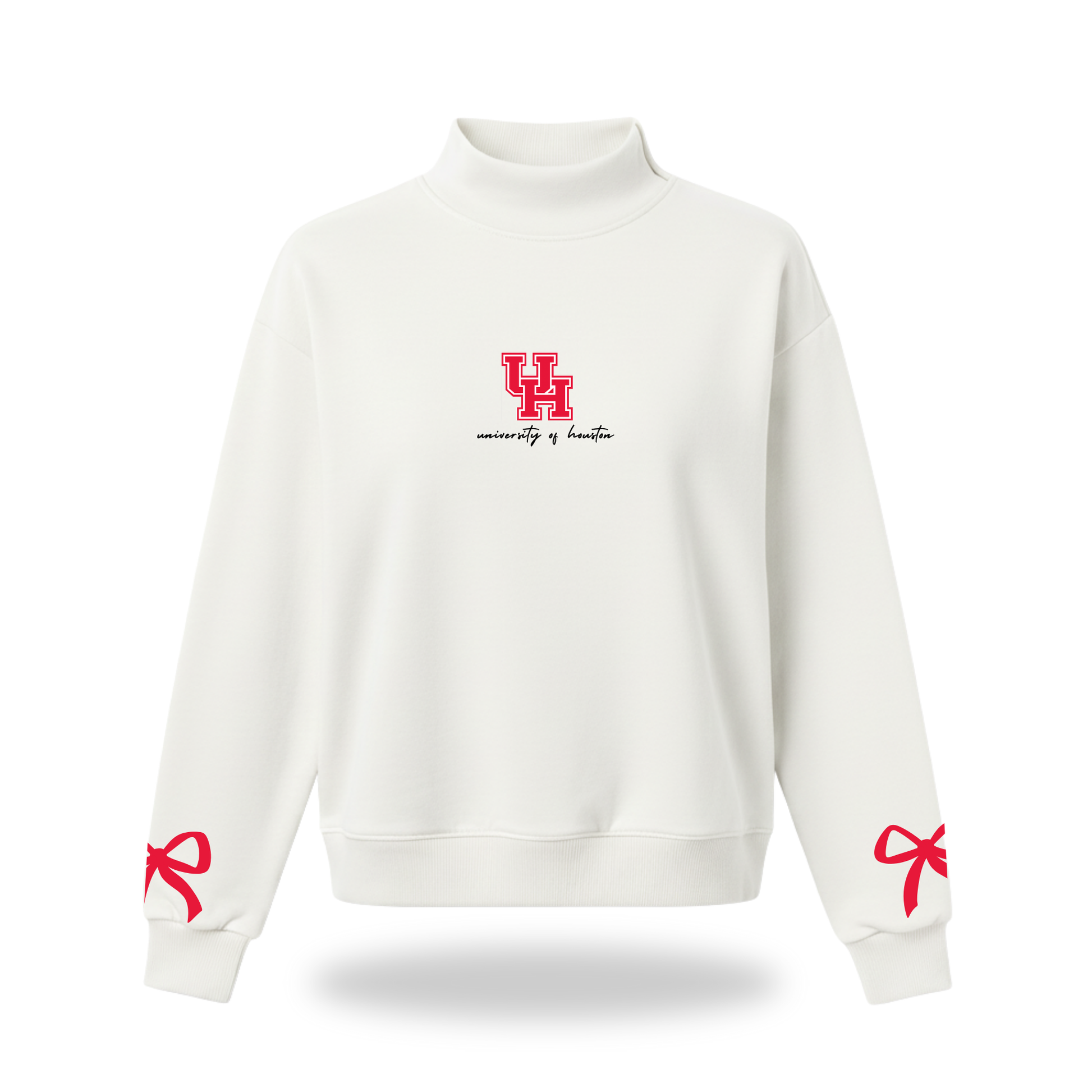 Mock Neck with scripted text below logo along with a matching bow at the bottom of both sleeves.