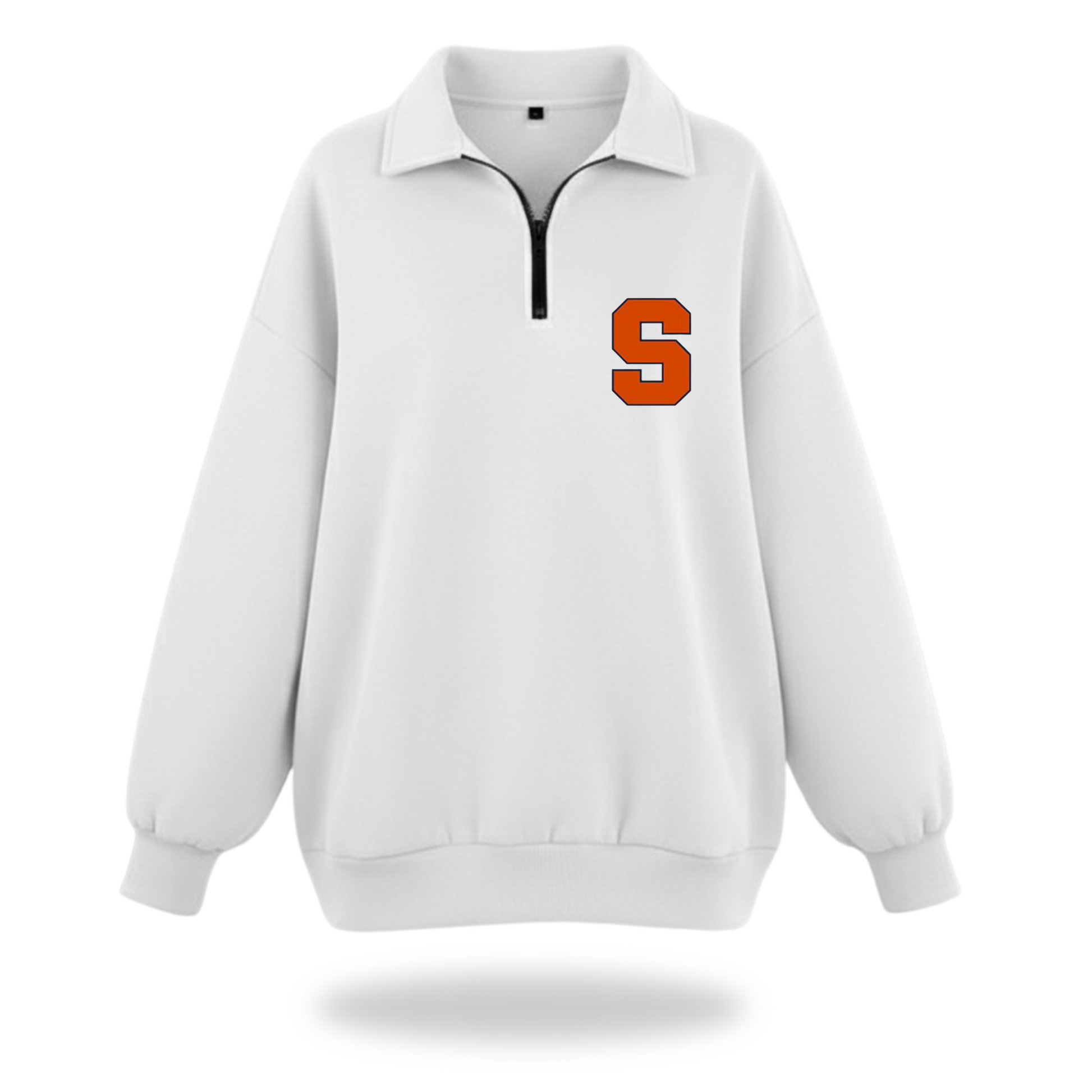 White collared quarter zip sweatshirt with with logo on the left chest.