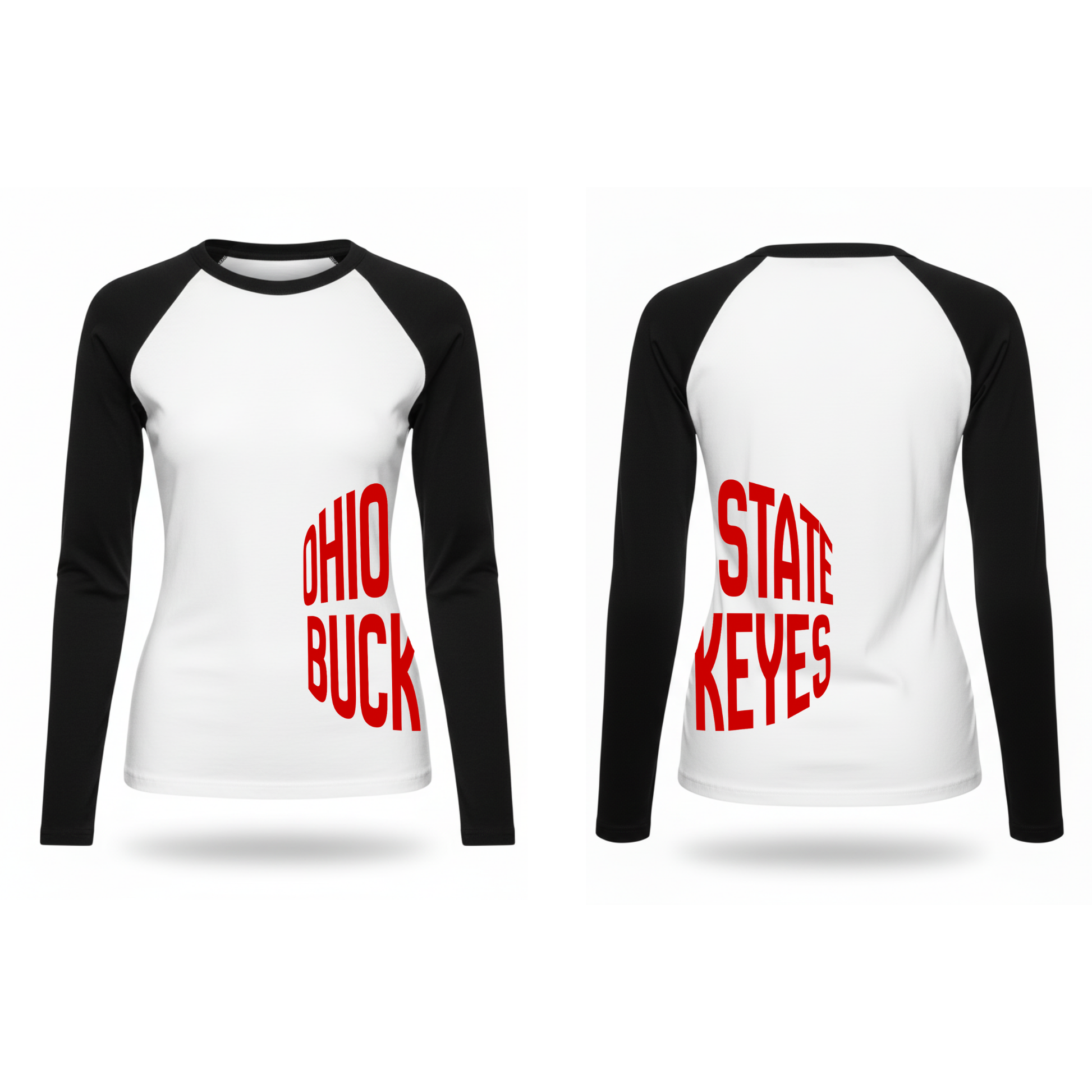 Fitted long sleeve shirt with a funky rounded design with custom text on the left side of the body.