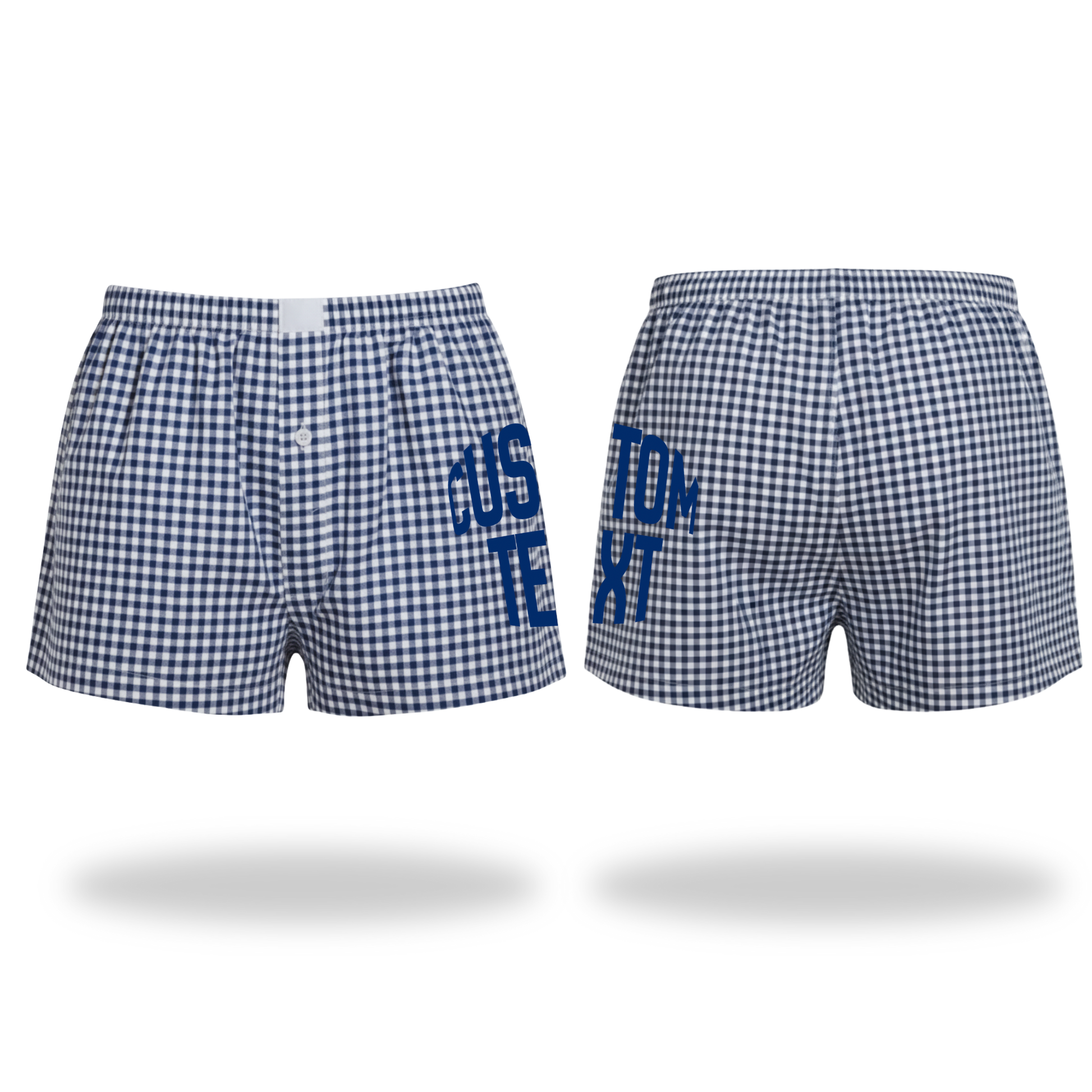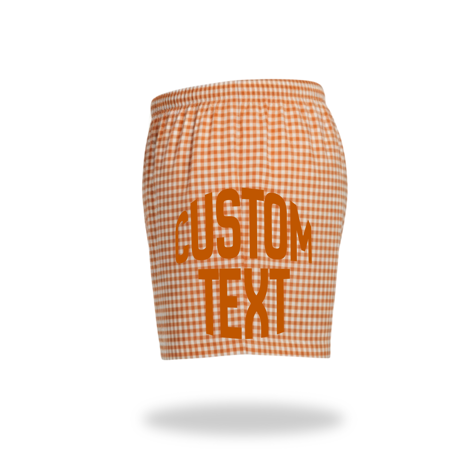 Gingham shorts with a funky rounded design with custom text on the left side of shorts.