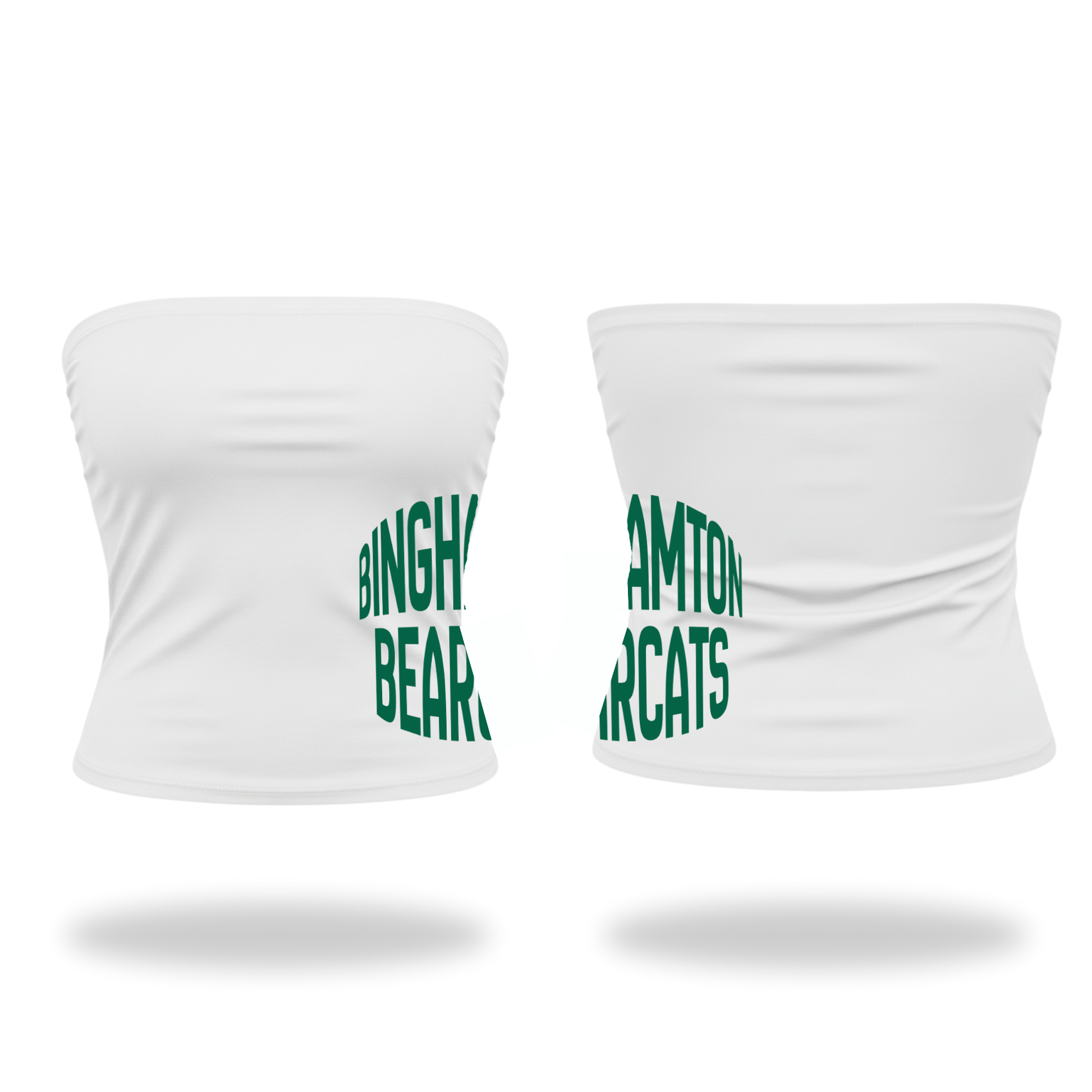 Tube top with with a funky rounded design with custom text on the left side of the body.