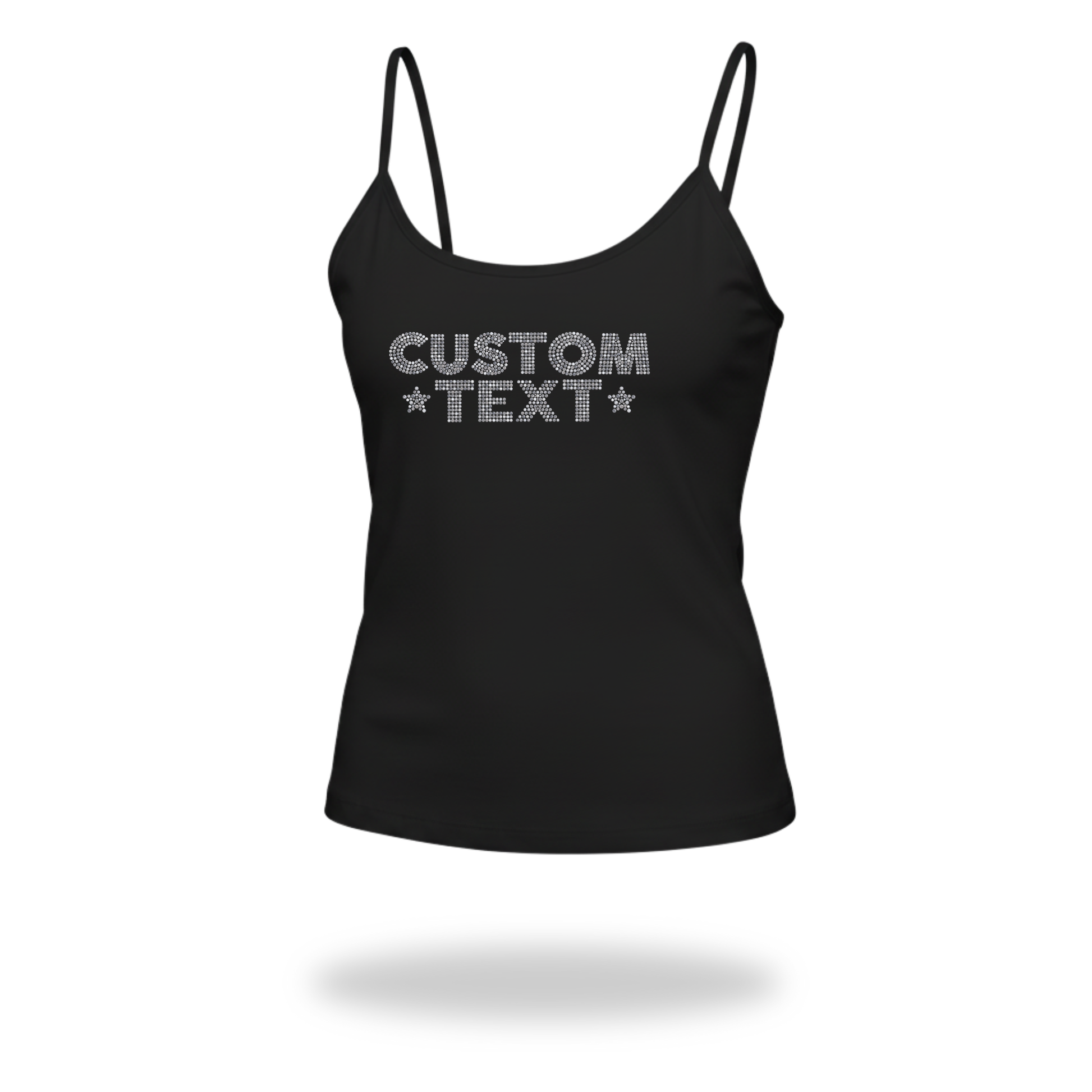 Spaghetti strap tank with bold gem stone text & mini gem stars (not real gems).
