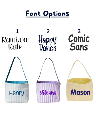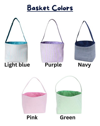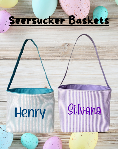 Personalized Seersucker Basket. Basket personalized with a name up to 8 letters embroidery approx 5 inches wide. The height of embroidery is dependent on the number of letters.
