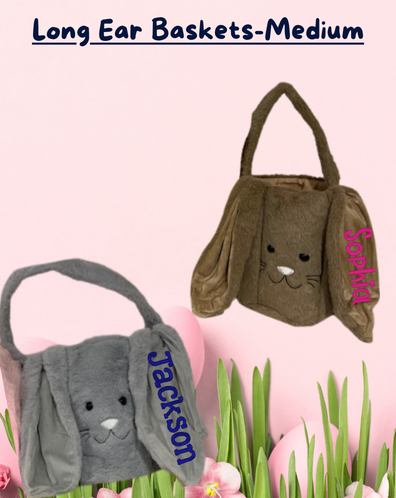 Embroidered Plush Bunny Long Ears Easter Basket. Personalize these adorable plush baskets with your choice of Font and Thread Color. Baskets can have one or both ears embroidered.