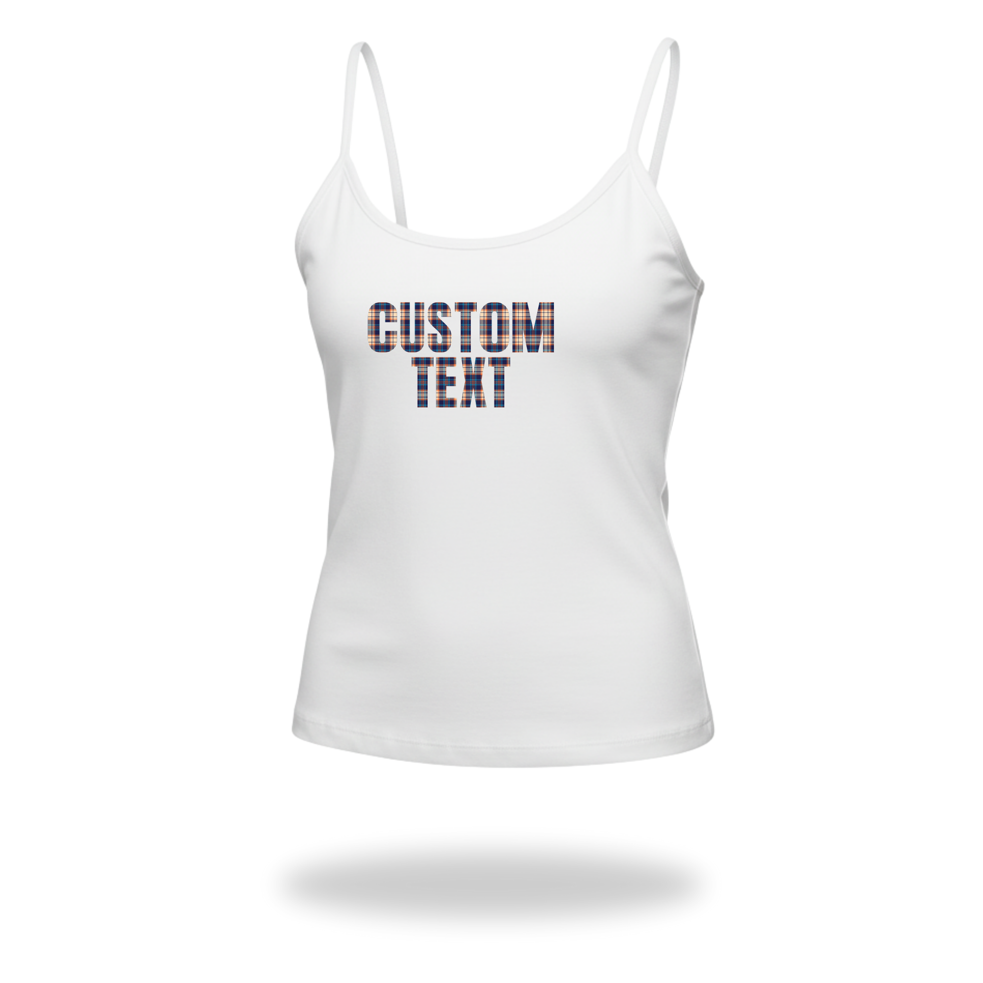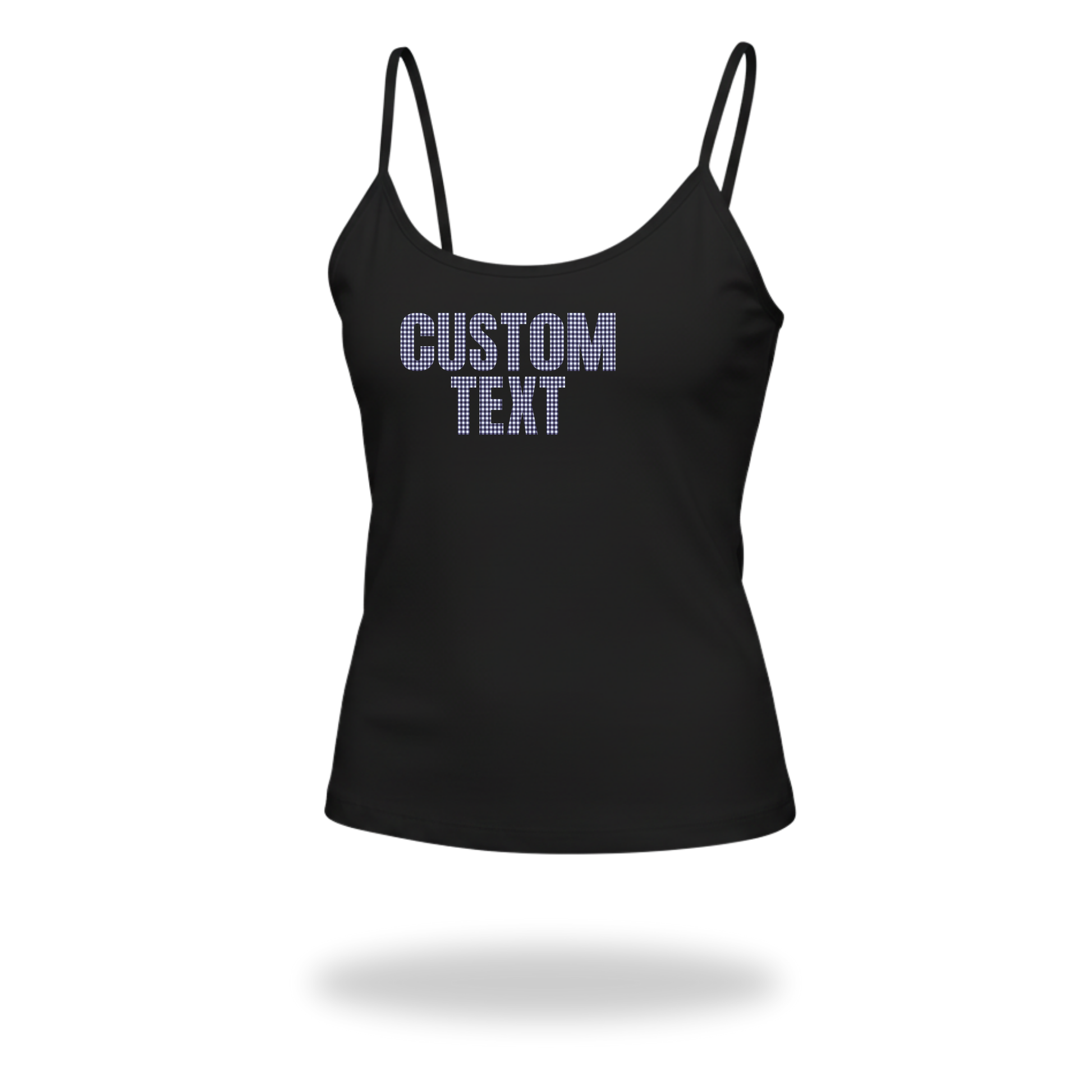Spaghetti strap tank with bold gingham text.