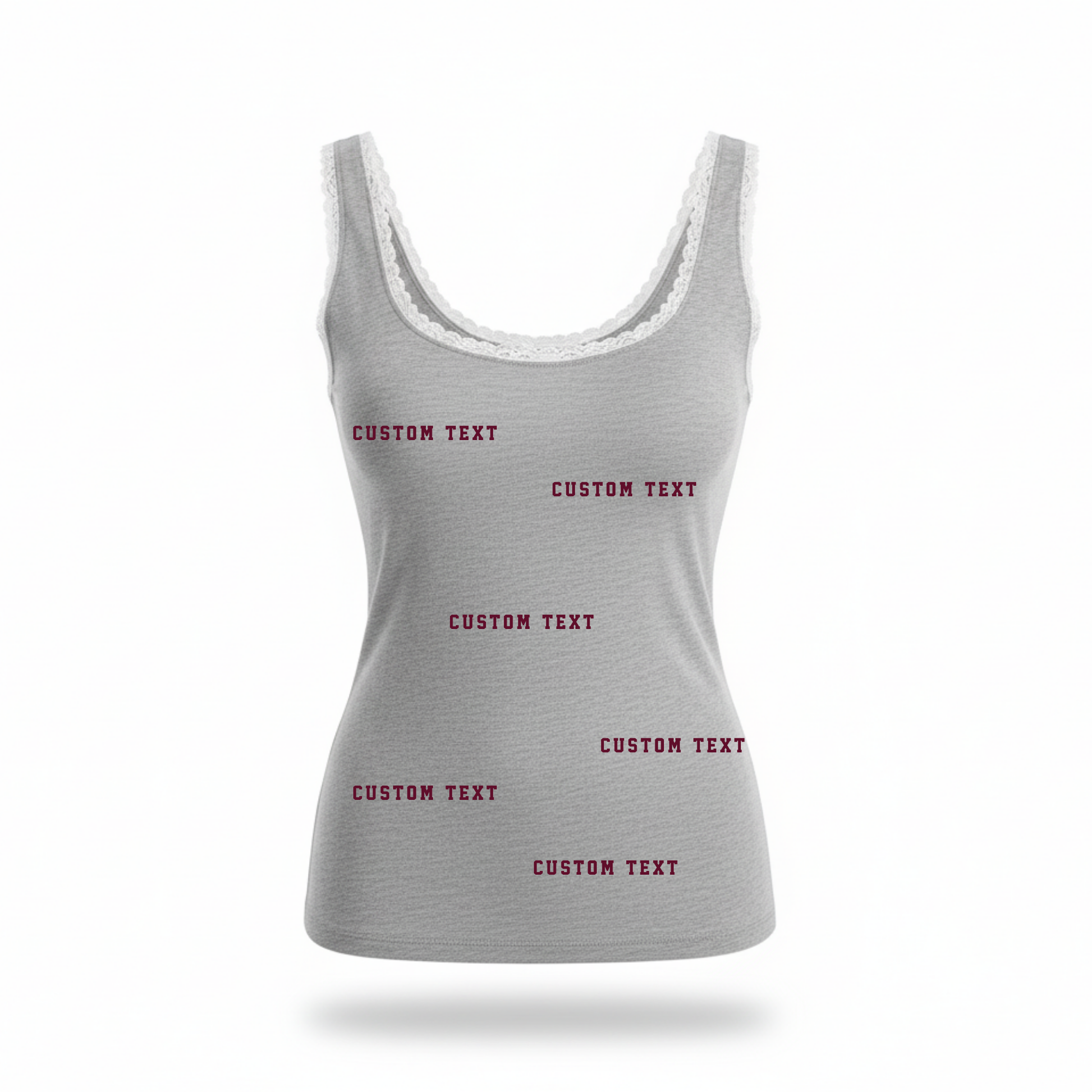 White lace trim gray tank top with scattered text on the front of the tank.