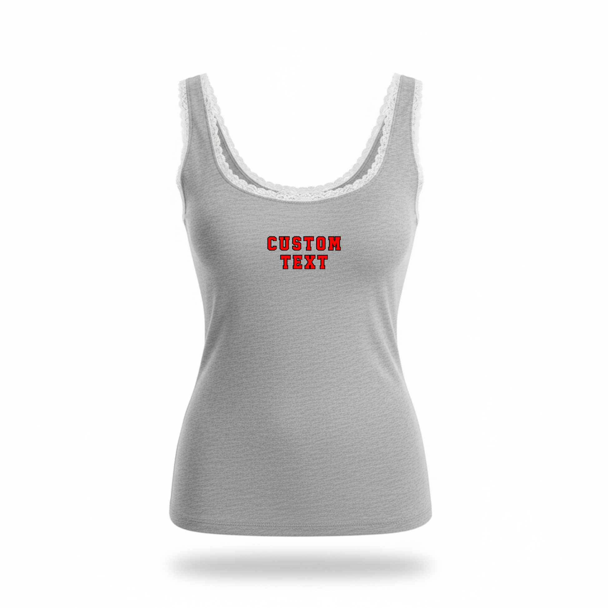 White lace trim gray tank top with bold duo color text.