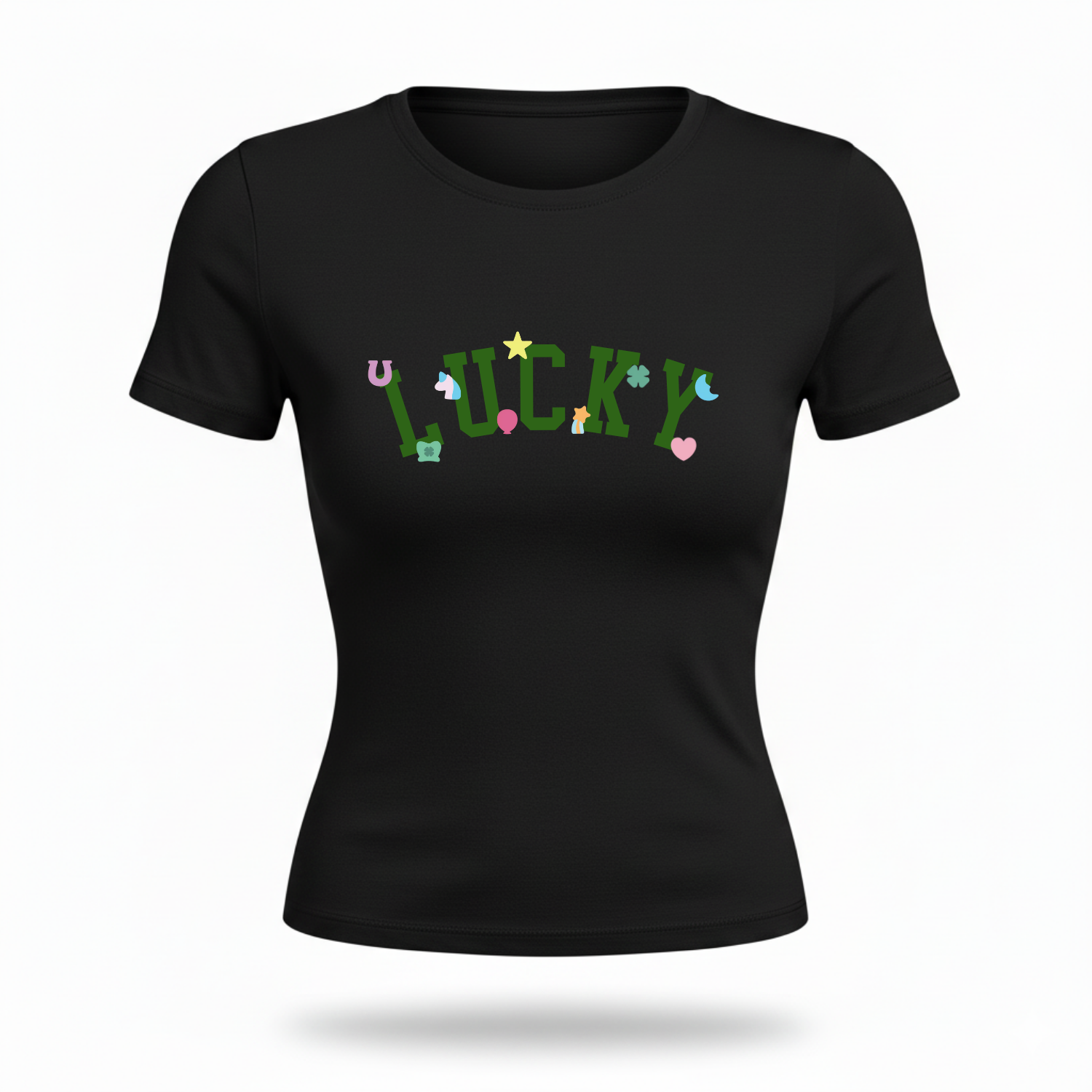 Fitted tee with "LUCKY" text and lucky charms.