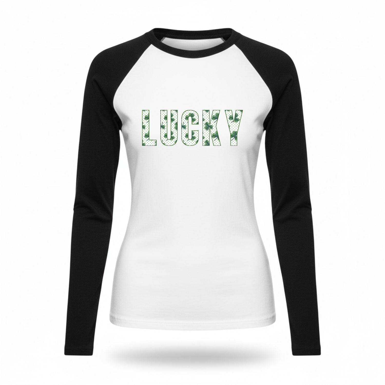 Fitted long sleeve shirt with "LUCKY" in St. Patricks text with green outline.