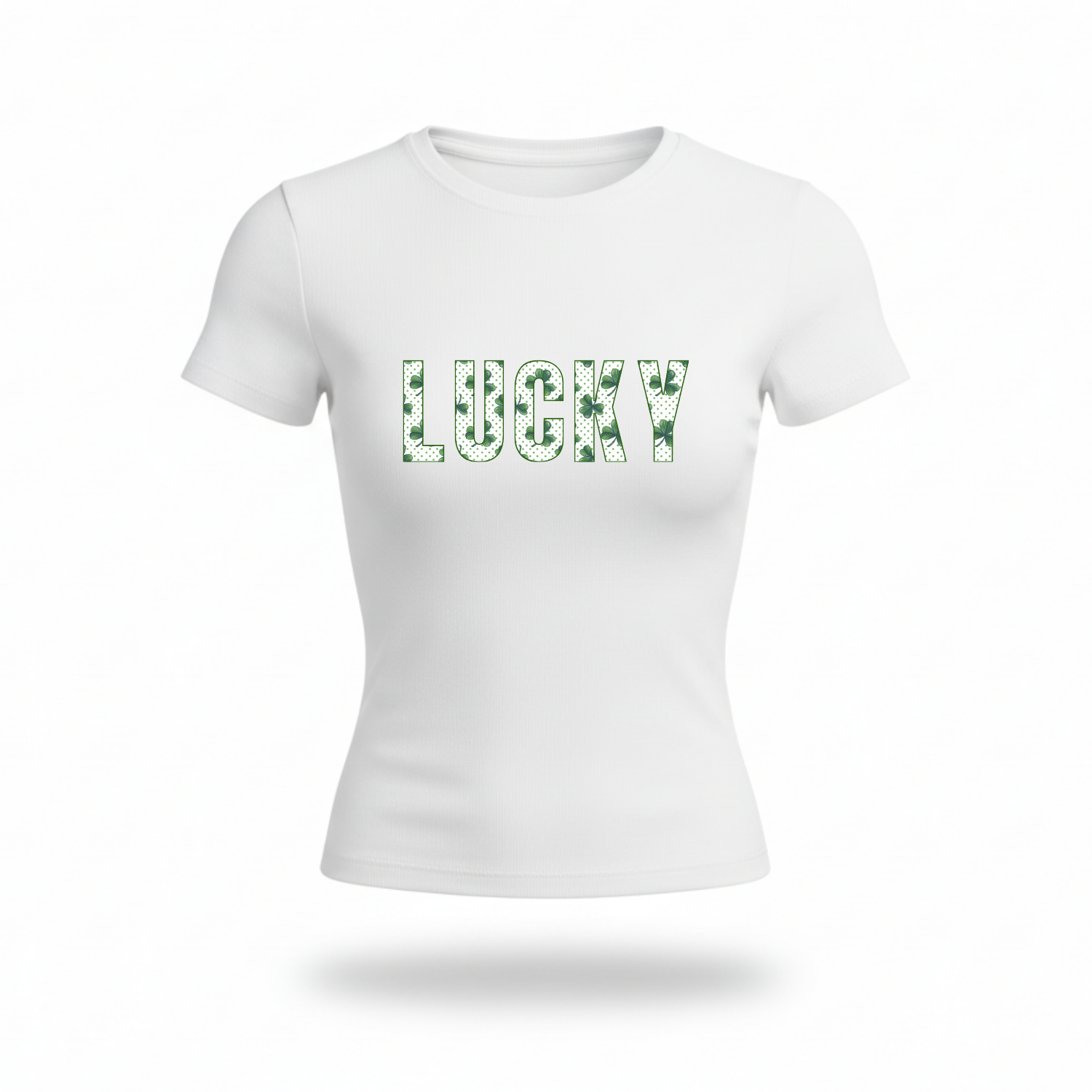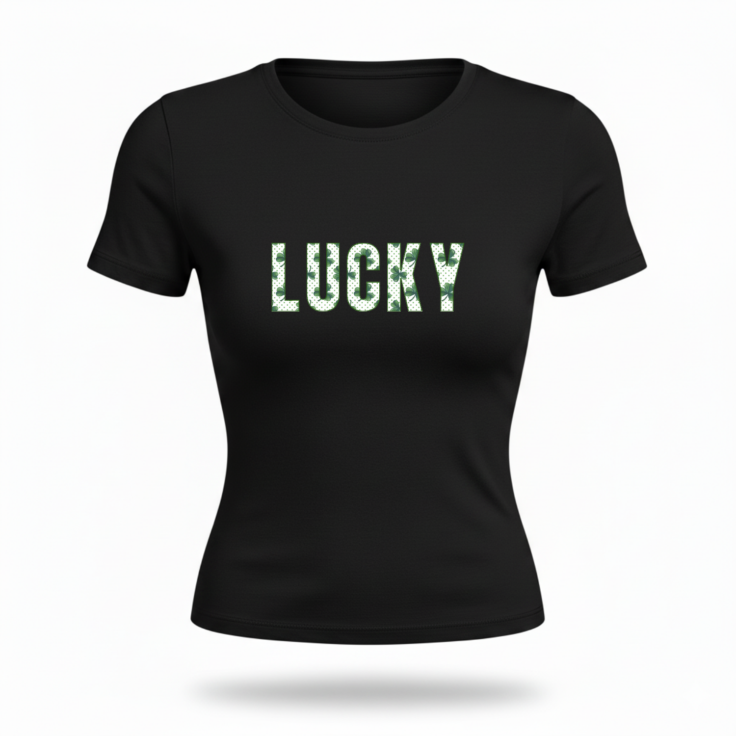 Fitted tee with "LUCKY" written in St. Patricks Day text and green outline.