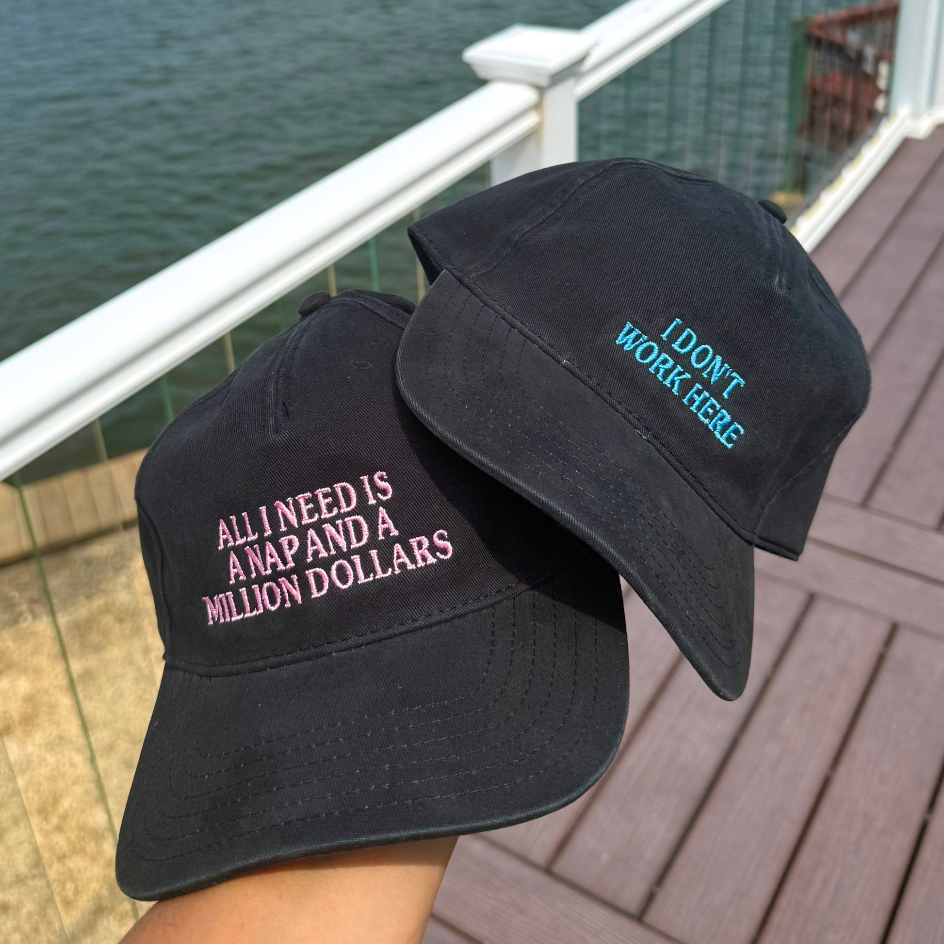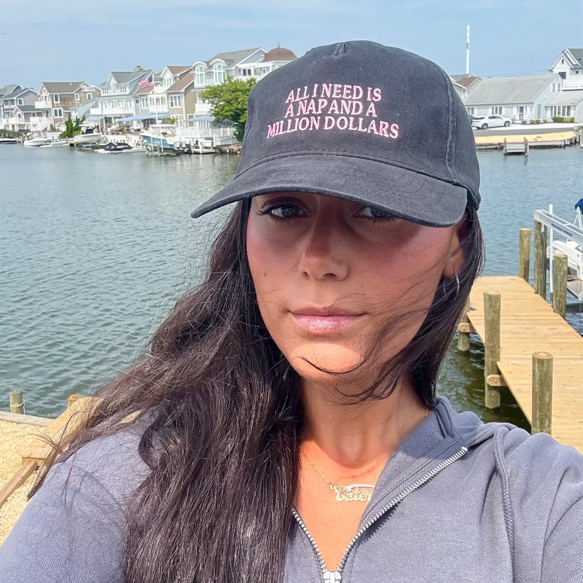 "ALL I NEED IS A NAP AND A MILLION DOLLARS " in pink embroidery