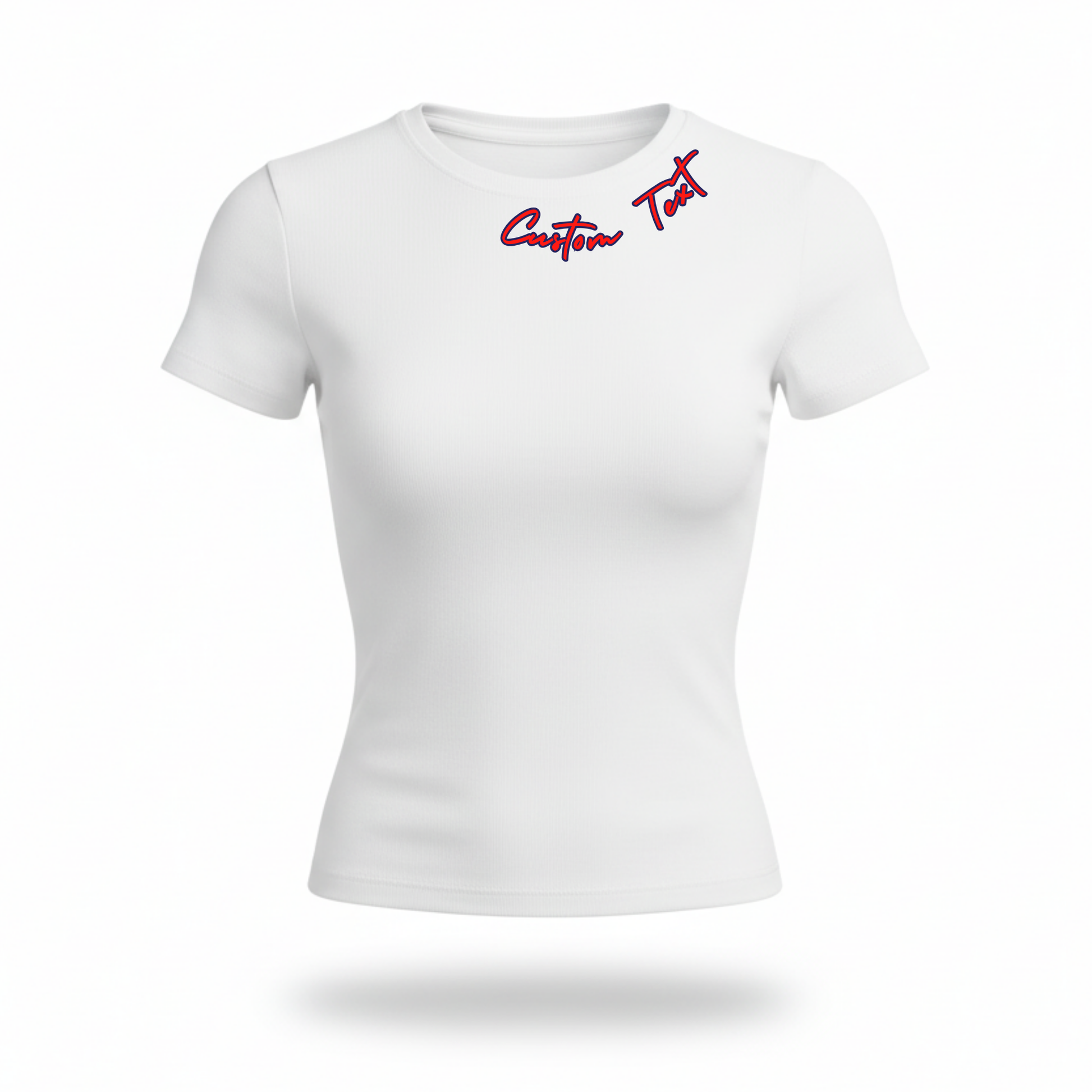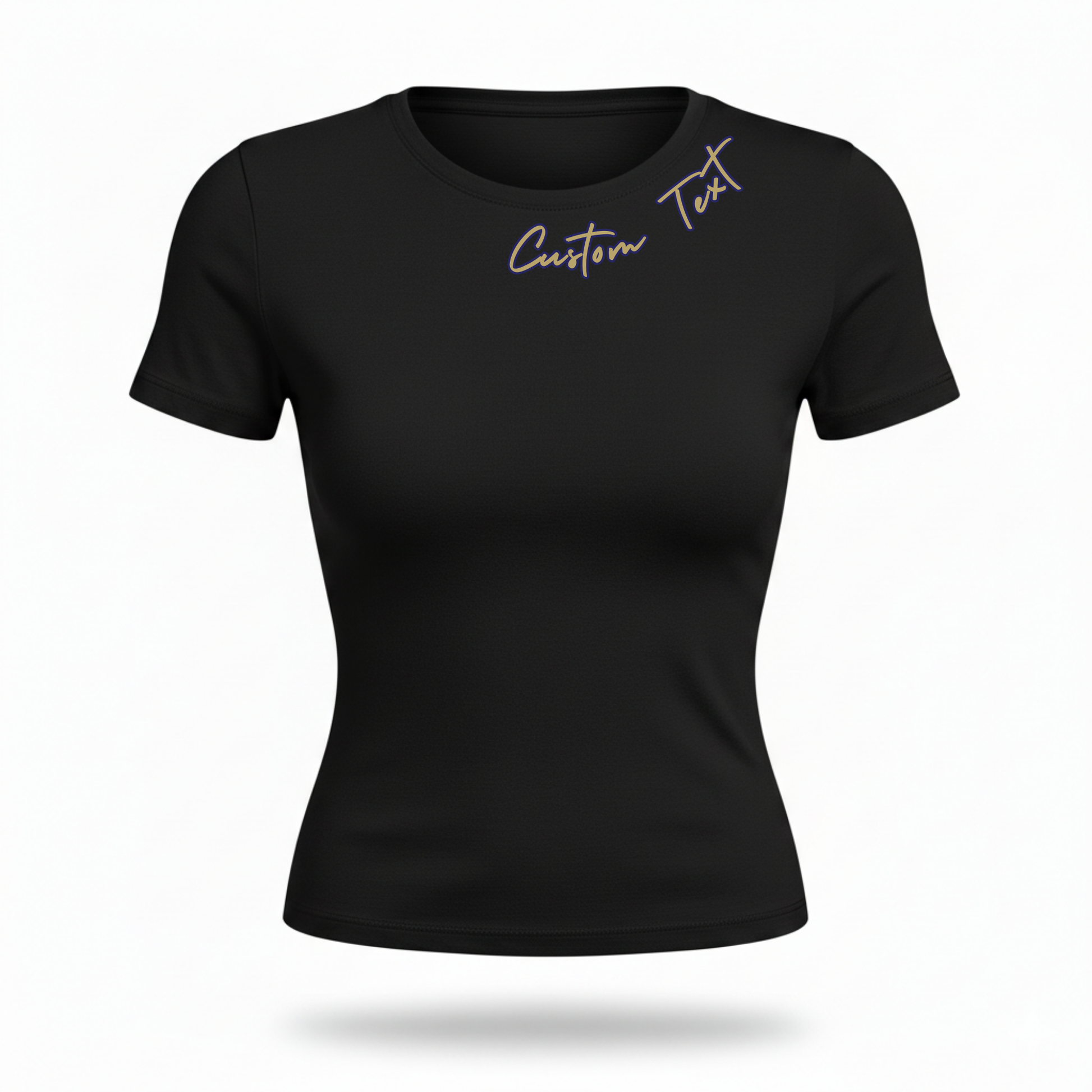 Fitted tee with duo color cursive text along the left side neckline.