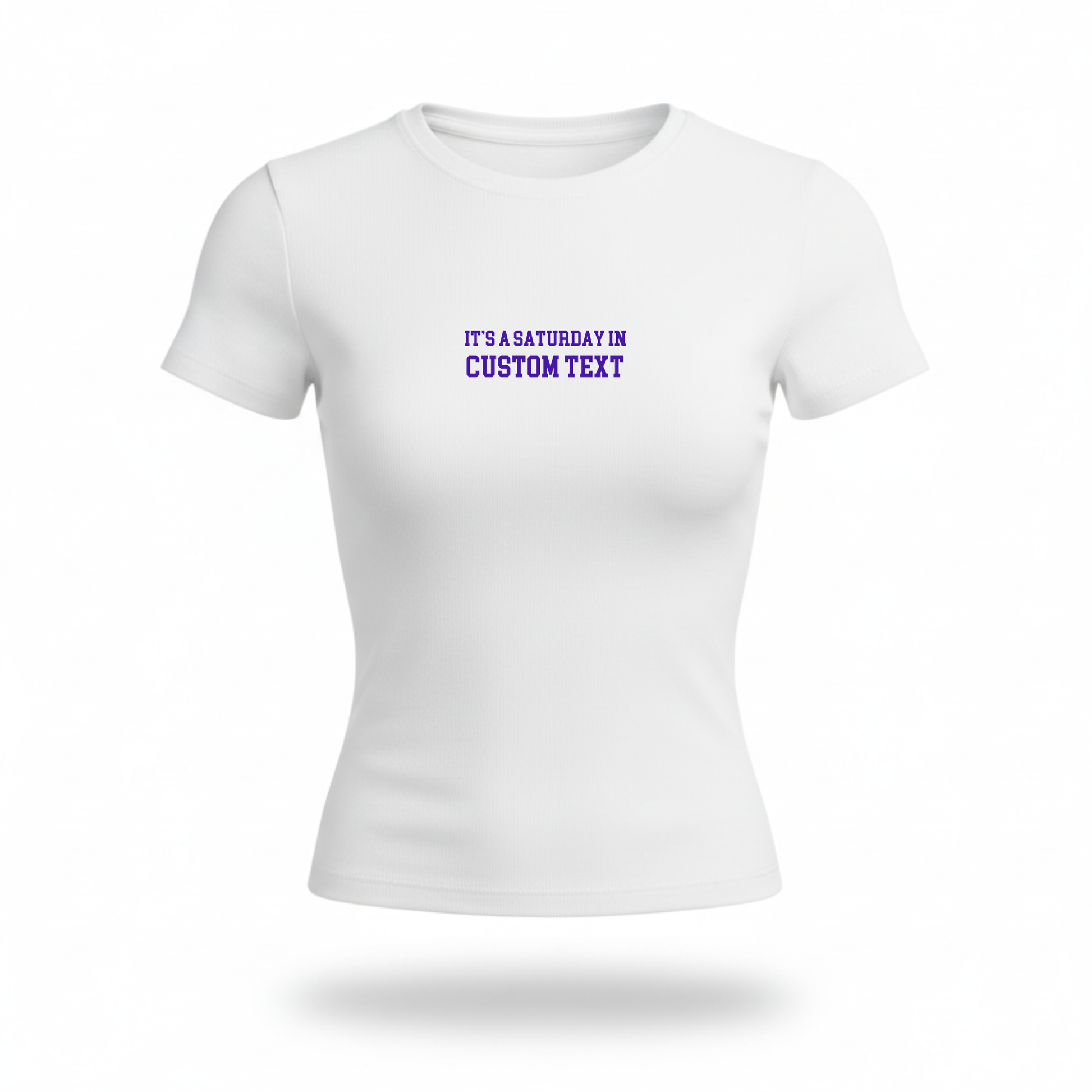 Fitted tee with "IT'S A SATURDAY IN [CUSTOM TEXT]" in custom colors.