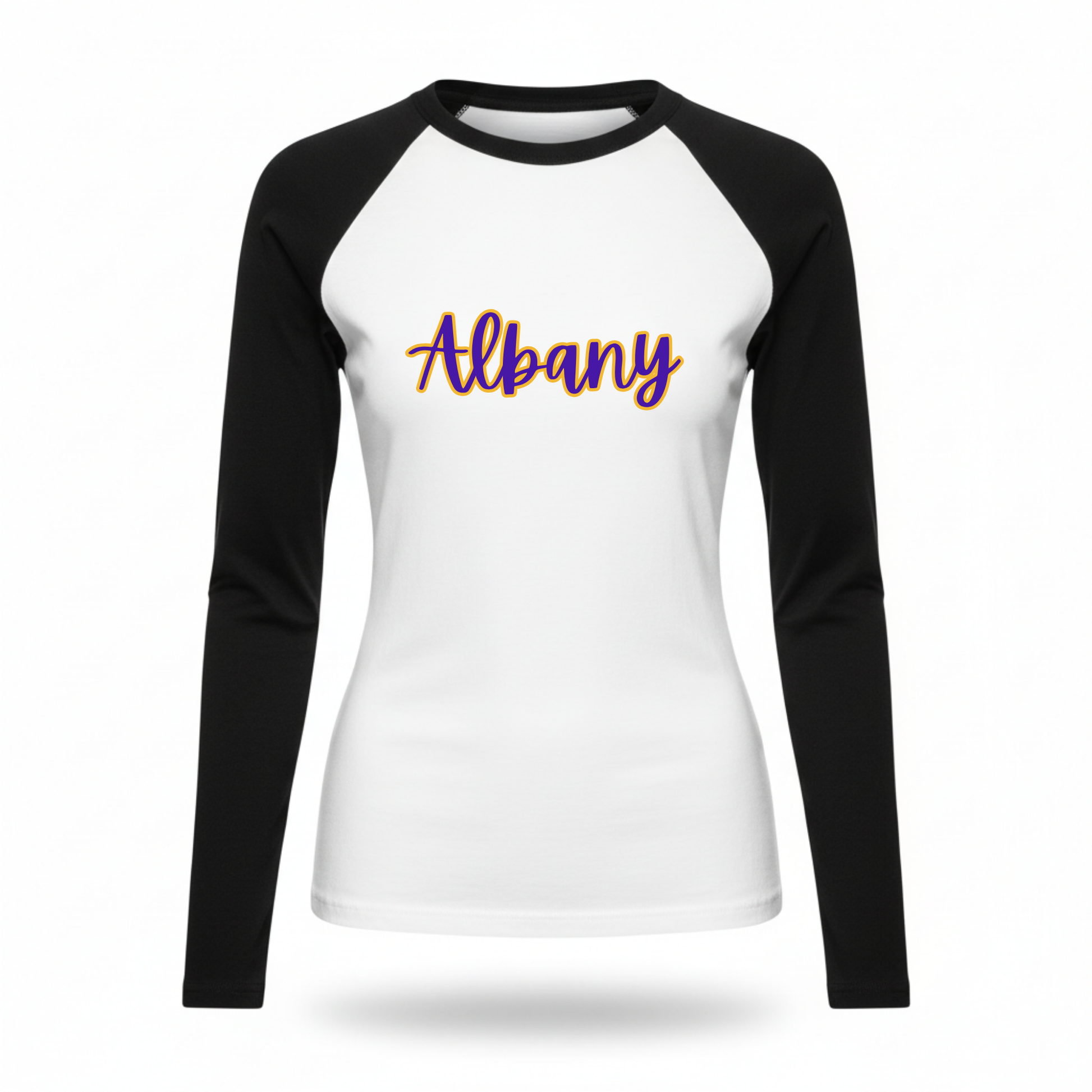 Fitted long sleeve shirt with duo color cursive text.