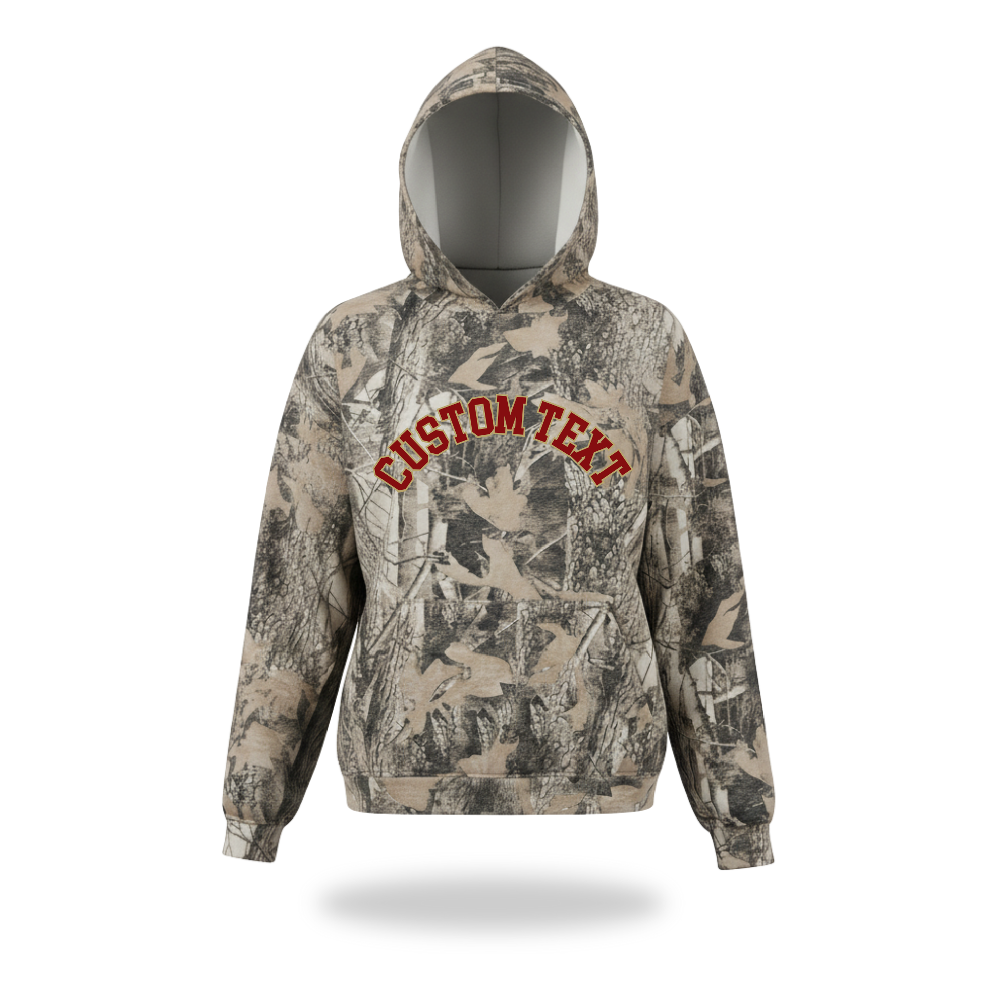 Camo Hoodie with bold duo color curved text.