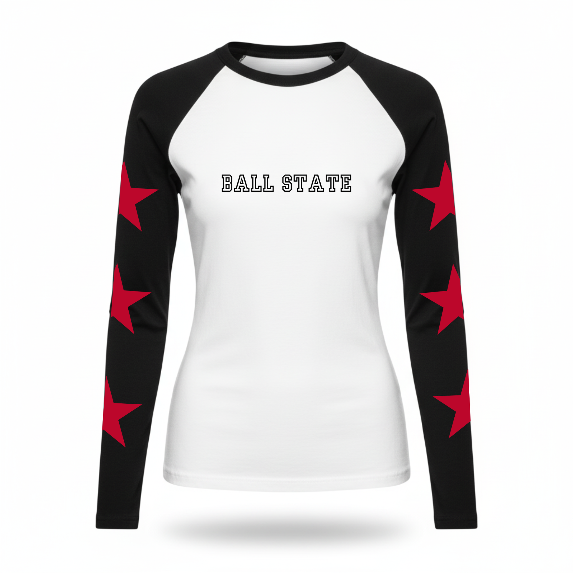 Fitted long sleeve shirt with outline text and star on the sleeves.